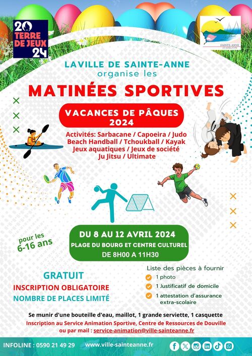 L’équipe du Service Animation Sportive de la Ville de Sainte-Anne accueillera des enfants âgés de 6 à 16 ans du lundi 8 au vendredi 12 avril 2024, de 8h00 à 11h30, au Centre culturel et à la plage du bourg.
