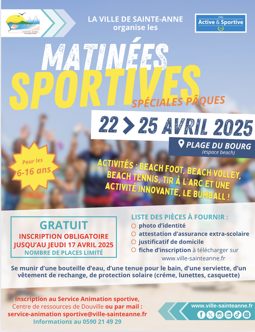 L’équipe du Service Animation Sportive de la Ville de Sainte-Anne accueillera des enfants âgés de 6 à 16 ans du mardi 22 au vendredi 25 avril 2025, de 8h30 à 11h30, à l’Espace Beach de la Plage du Bourg.