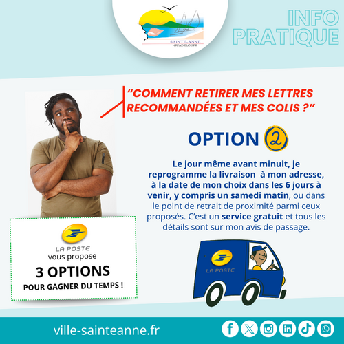 – OPTION 2 : le jour même avant minuit, reprogrammez la livraison à votre adresse, à la date de votre choix dans les 6 jours à venir, y compris un samedi matin, ou dans le point de retrait de proximité parmi ceux proposés. C’est aussi un service gratuit et tous les détails sont sur votre avis de passage.