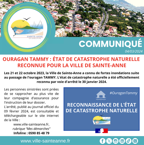 Les 21 et 22 octobre 2023, la Ville de Sainte-Anne a connu de fortes inondations suite au passage de l’ouragan TAMMY. L’état de catastrophe naturelle a depuis été officiellement reconnu par voie d’arrêté le 30 janvier 2024.