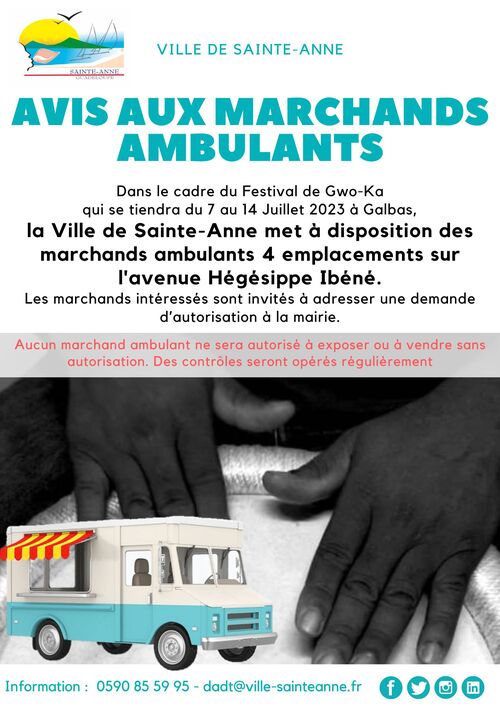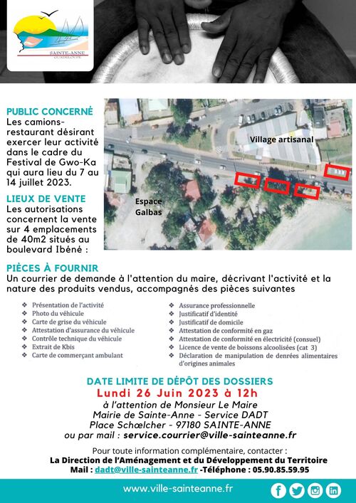 Dans le cadre du Festival de Gwo-Ka qui se tiendra du 7 au 14 Juillet 2023 à Galbas, la Ville de Sainte-Anne met à disposition des marchands ambulants 4 emplacements sur l’avenue Hégésippe Ibéné.