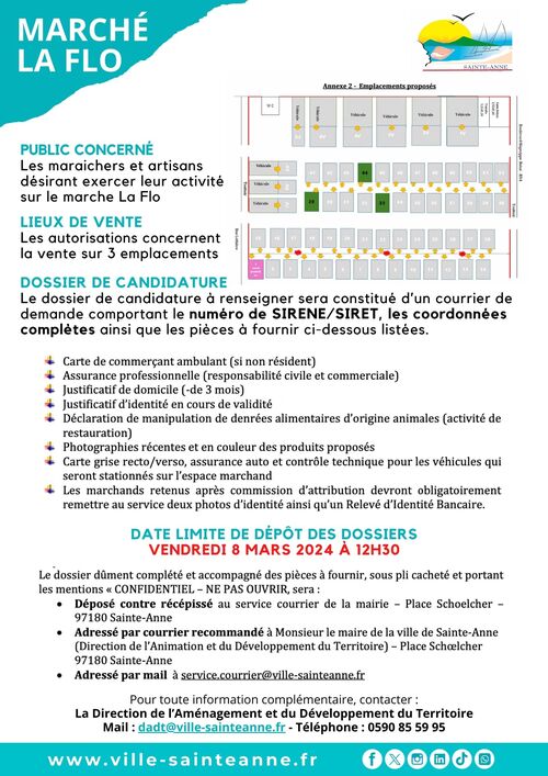 – Adressé par mail à service.courrier chez ville-sainteanne.fr - (au format acrobat reader (pdf) uniquement) – Préciser l’objet : Candidature marché La Flo