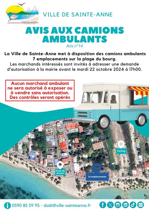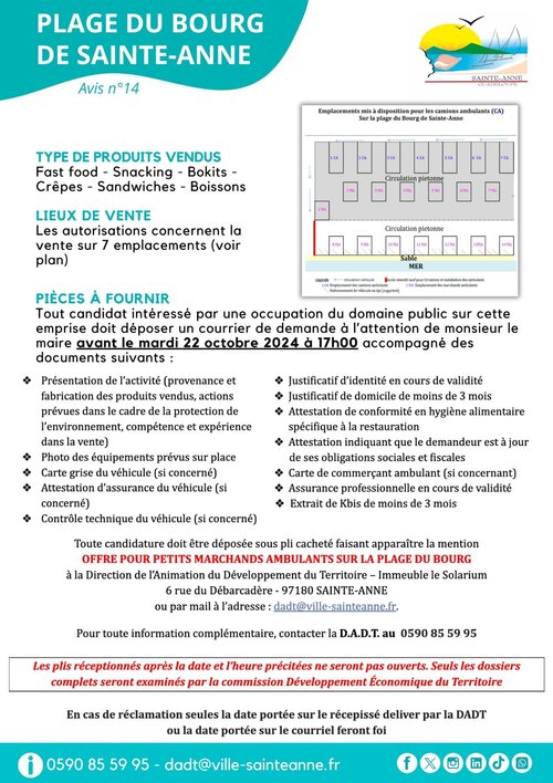 – sous pli cacheté portant la mention OFFRE POUR CAMION AMBULANT SUR LA PLAGE DU BOURG à la Direction de l’Animation du Développement du Territoire – Immeuble le Solarium – 6 rue du Débarcadère - 97180 SAINTE-ANNE
