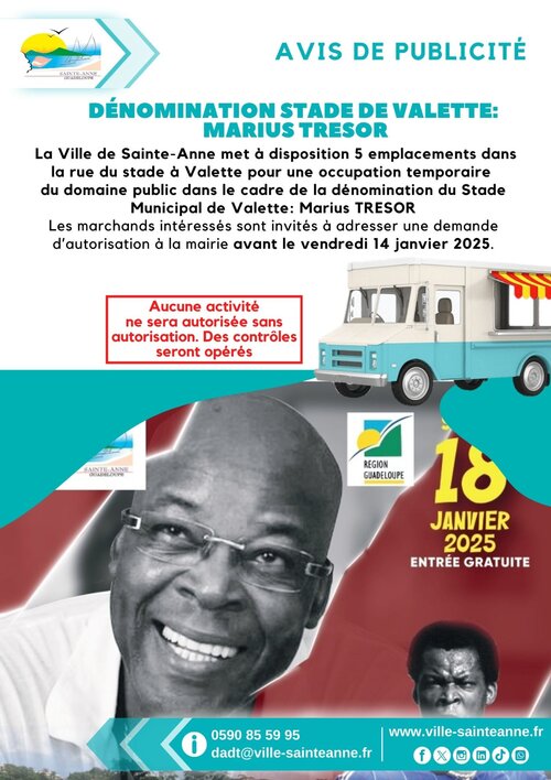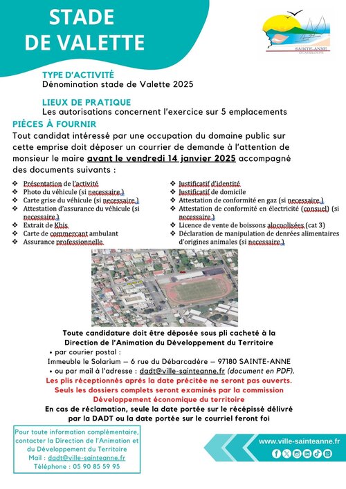 Pour toute information complémentaire, contacter : La Direction de l’Animation et du Développement du Territoire –Mail : dadt chez ville-sainteanne.fr - Téléphone : 05.90.85 59 95